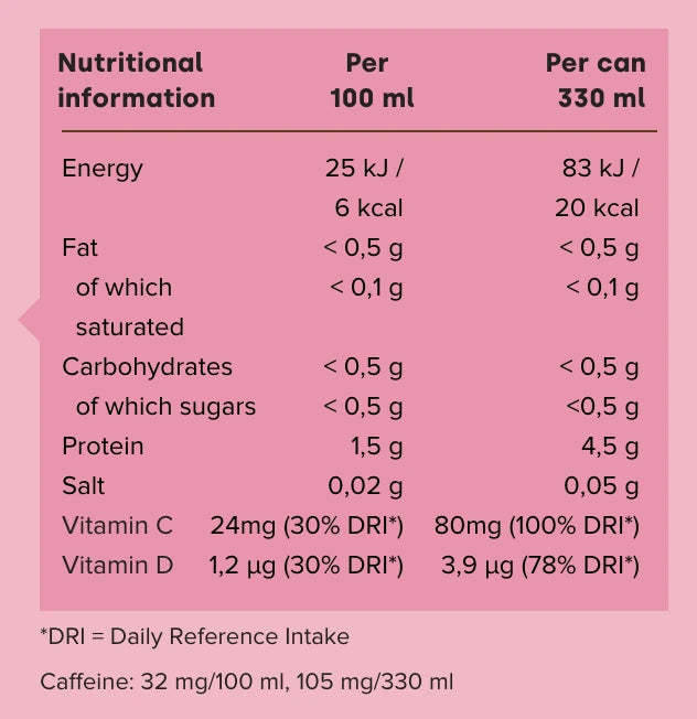 Brīdinājums: augsts kofeīna saturs (32 mg/100 ml; 105 mg/330 ml). Maksimāli 2 bundžas dienā. Nav ieteicams bērniem, grūtniecēm/zīdītājām un kofeīna jutīgiem cilvēkiem. Ieteicams no 18 gadu vecuma.