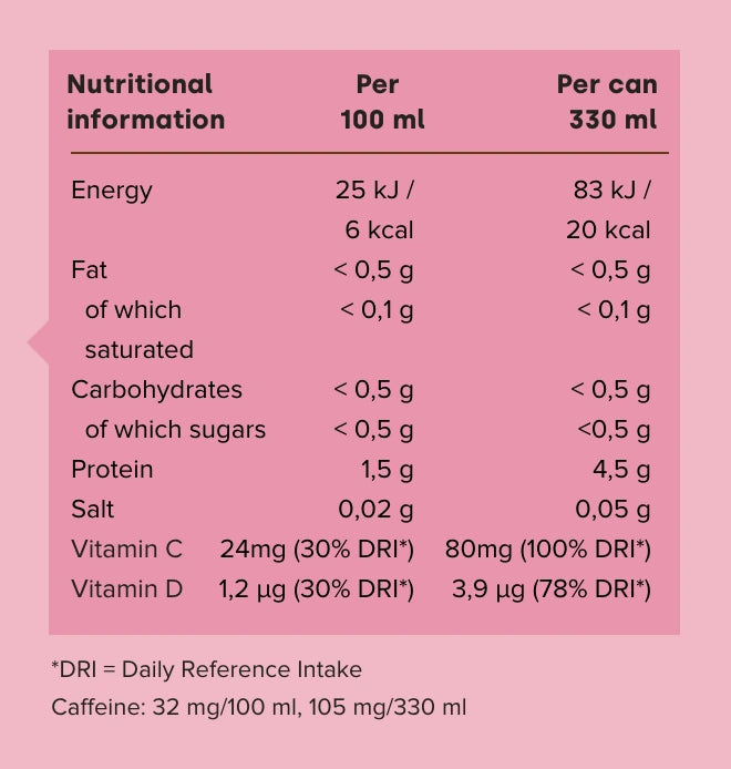 Viegls dzirkstošs bezcukura kolagēna dzēriens ar ogu garšu, kas dod enerģiju un “mirdzuma” sajūtu. Satur 1,5% hidrolizēta kolagēna, 105 mg kofeīna un vitamīnus C un D. Patīkami svaigs un saldi ogains – kā varavīksne bundžā, bet pieaugušo stilā.