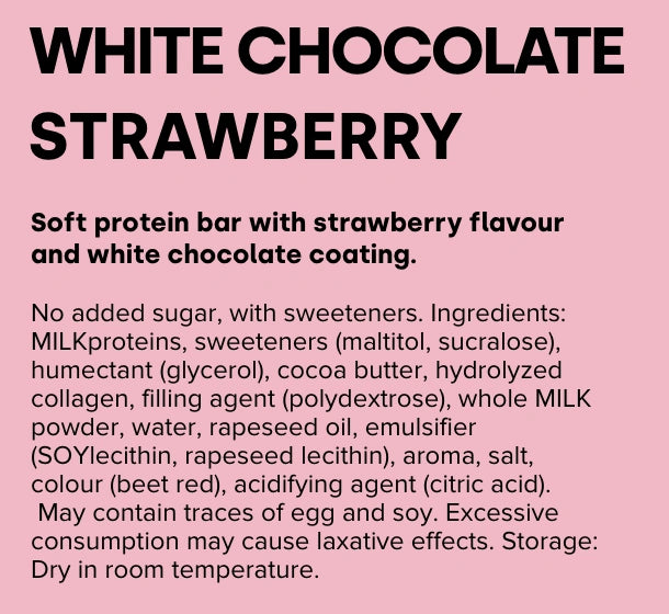 LOHILO proteīna batoniņš ar zemeņu garšu, pārklāts ar baltās šokolādes kārtu (17%). Bez pievienota cukura, ar saldinātājiem. Sastāvdaļas: PIENA olbaltumvielas, saldinātāji (maltitols, sukraloze), mitruma saglabātājs (glicerīns), kakao sviests, hidrolizēts kolagēns, pildviela (polidekstroze), pilnpiena pulveris (PIENS), ūdens, rapšu eļļa, emulgators (SOJAS lecitīns, rapšu lecitīns), aromāts, sāls, krāsviela (bietes sarkans), skābuma regulators (citronu skābe). Var saturēt OLAS un SOJAS pēdas. Pārmērīga lietošana var izraisīt caureju. Uzglabāšana: glabāt sausā istabas temperatūrā.